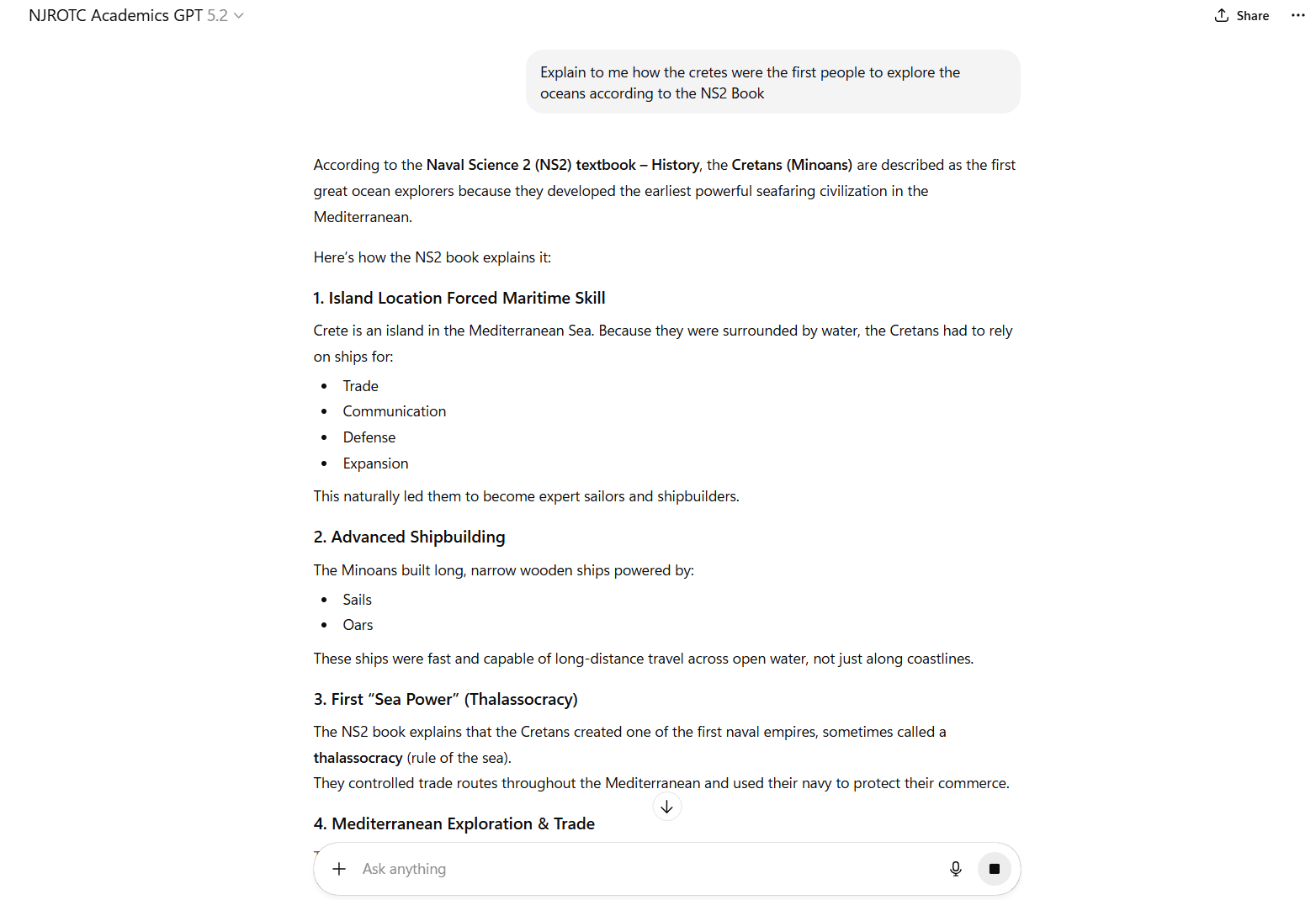Developed a database containing over 20,000 structured academic knowledge entries derived from NJROTC curriculum materials.