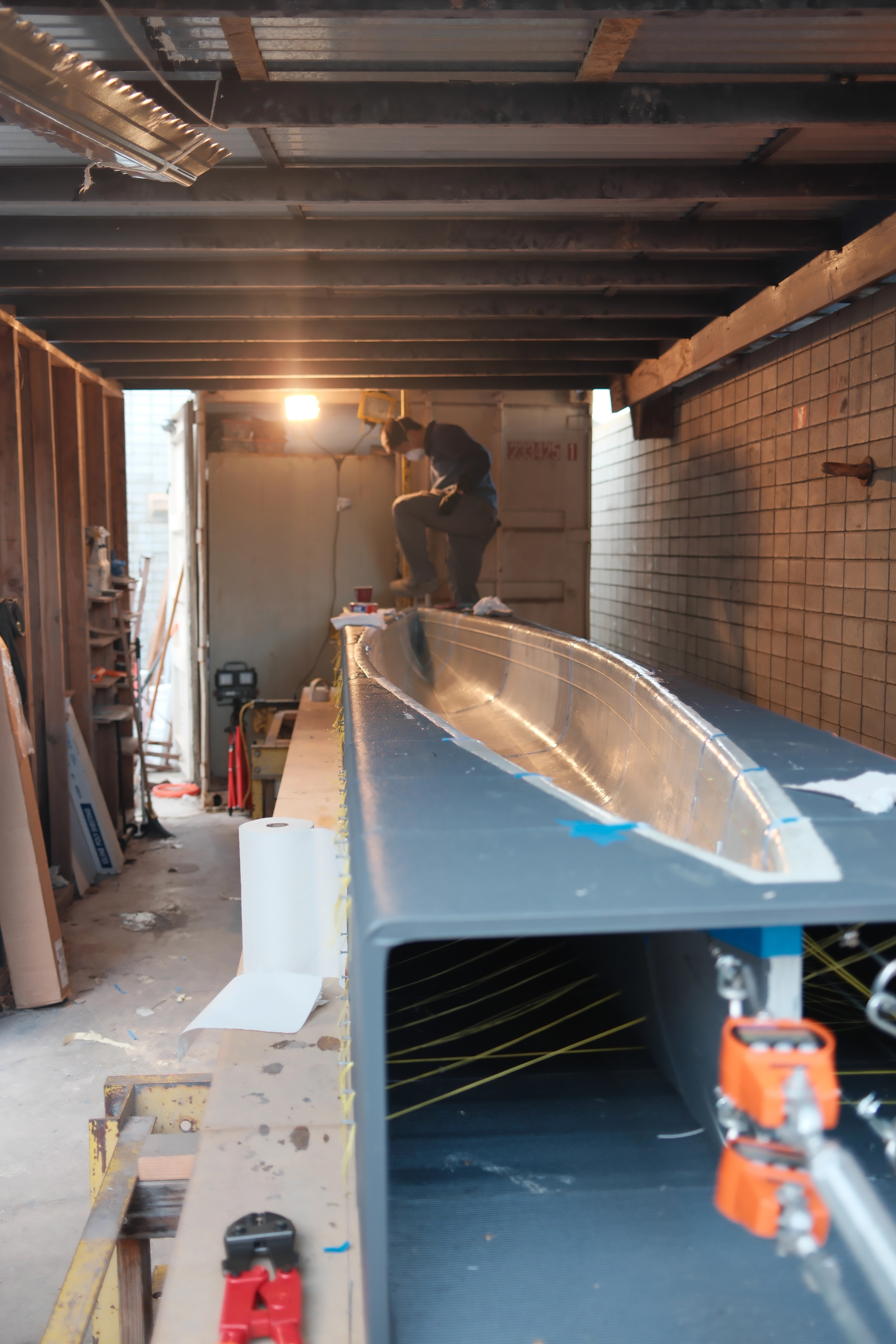 The canoe hull is created through multiple layers of specialized lightweight concrete poured into the mold.