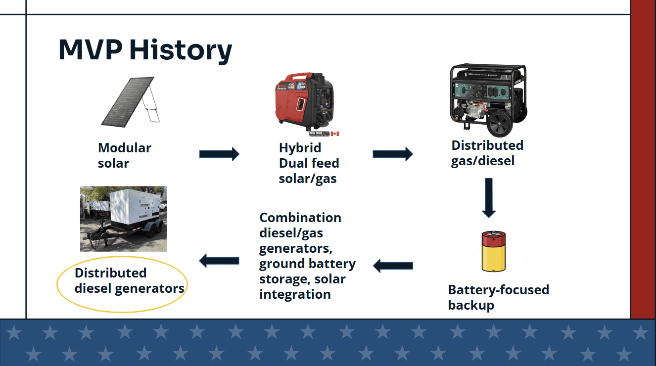 Identified sustainment challenges including fuel logistics, generator maintenance, and infrastructure redundancy.