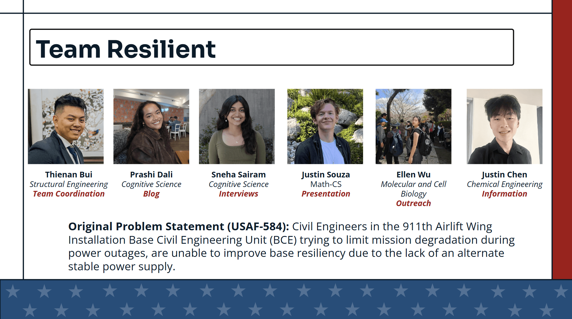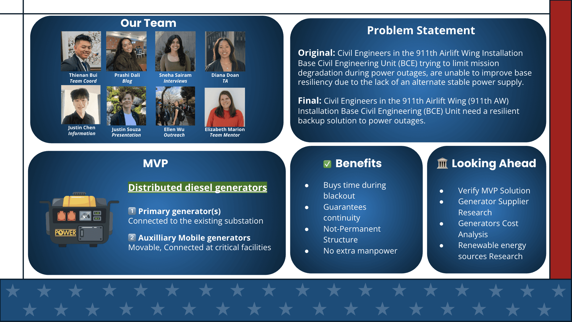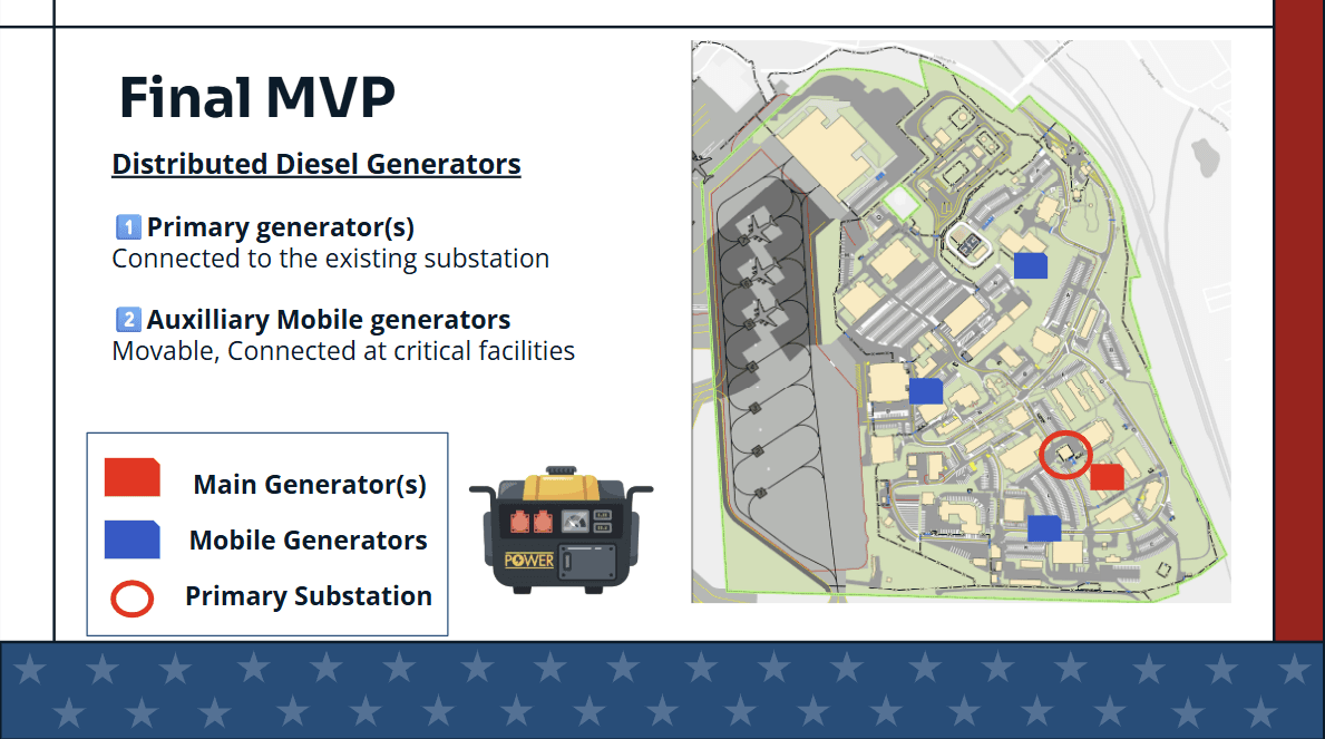 Designed a scalable energy-resilience modernization concept for a U.S. Air Force installation, strengthening mission continuity during grid outages and infrastructure disruptions.